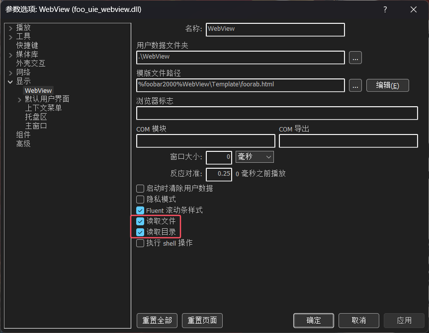 2、 首先:打开 foobar2000 “参数设置-显示-WebView“ 选项,确保下图中的选项已勾选并应用: